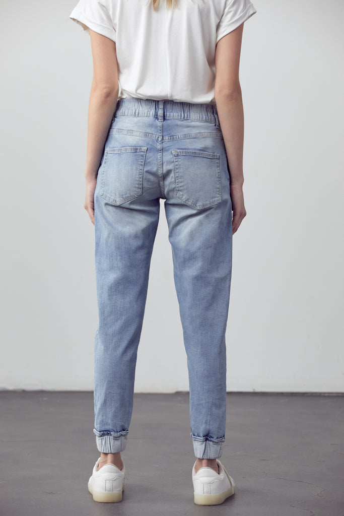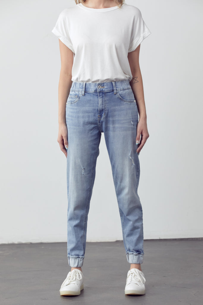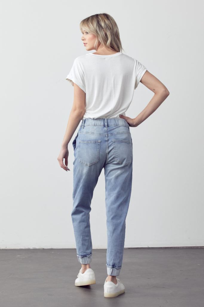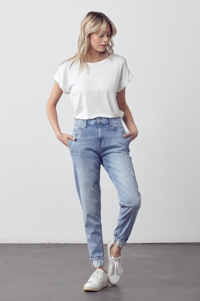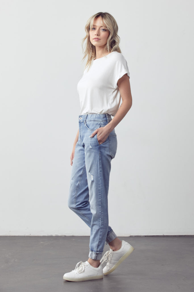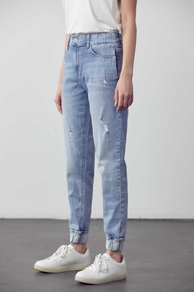Relaxed and stretchy denim jogger pants with slight distress. Comfortable and loosely fitted around the hips & thigh.