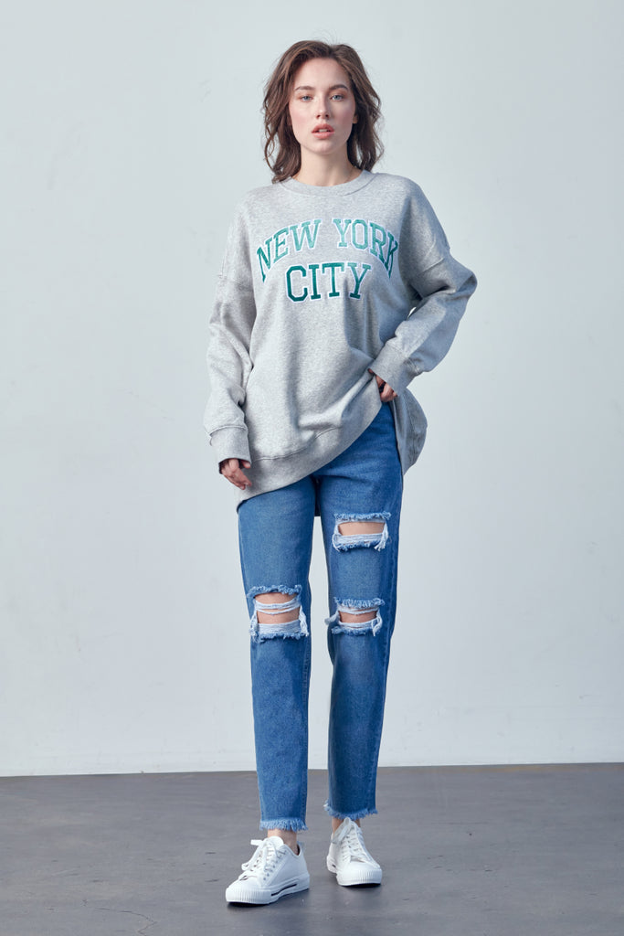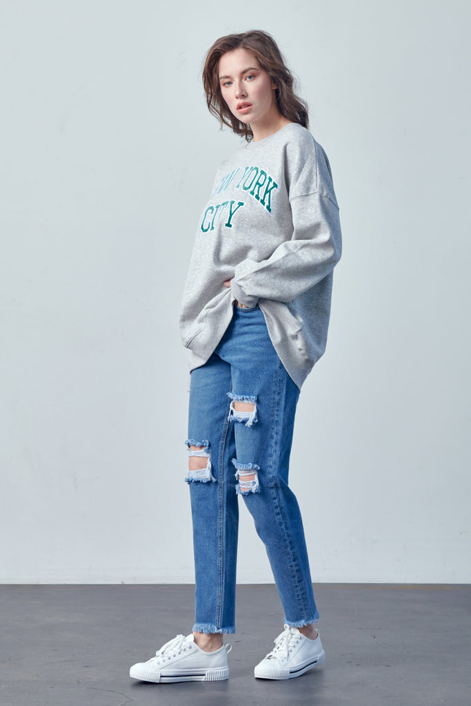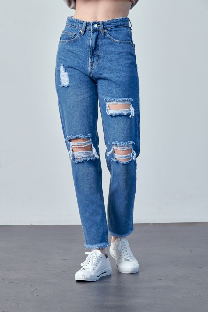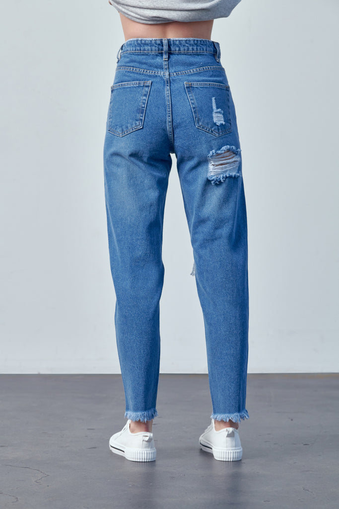 Relaxed, high waisted mom jeans with comfortably fitted hip in rigid fabric. Traditional five pockets with zip and metal button closure.