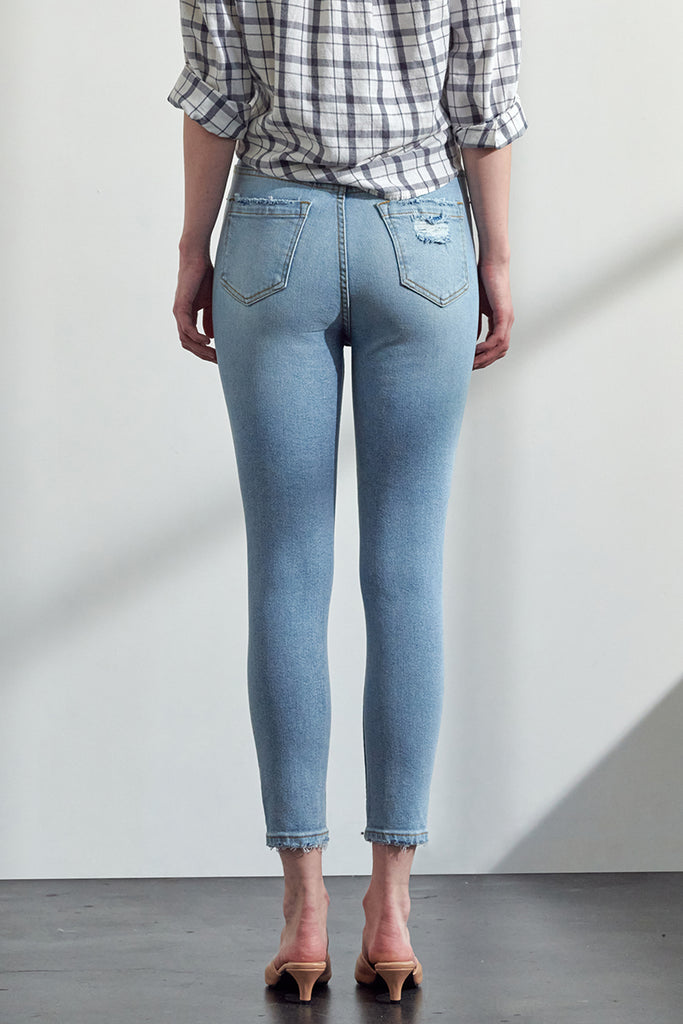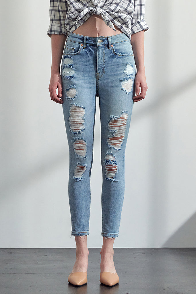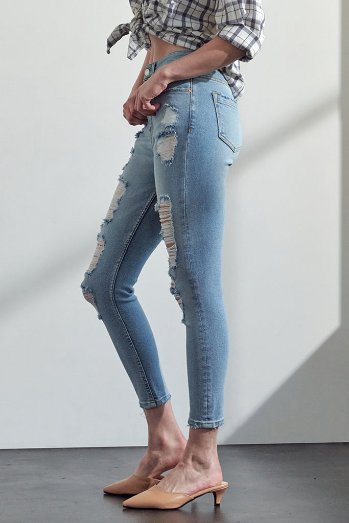 High-rise, distressed skinny jeans with five pockets. Front zip and metal button closure. Made with 2% spandex to provide a stretchy, comfortable fit all over.
