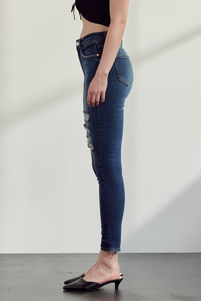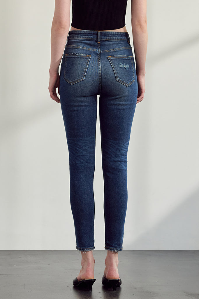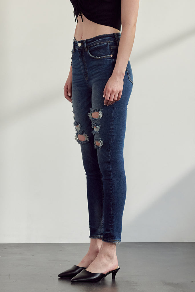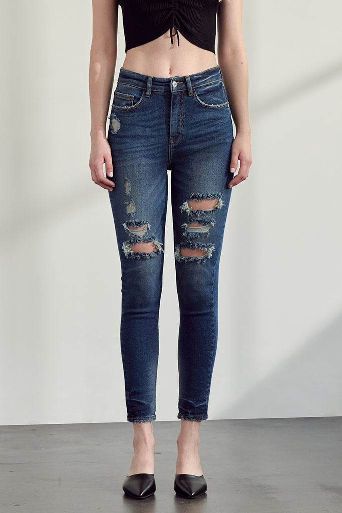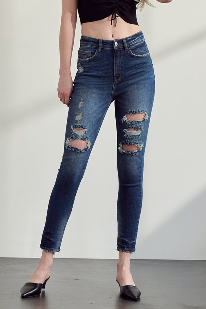 High-rise, distressed skinny jeans with five pockets. Front zip and metal button closure. Made with 2% spandex to provide a stretchy, comfortable fit all over.