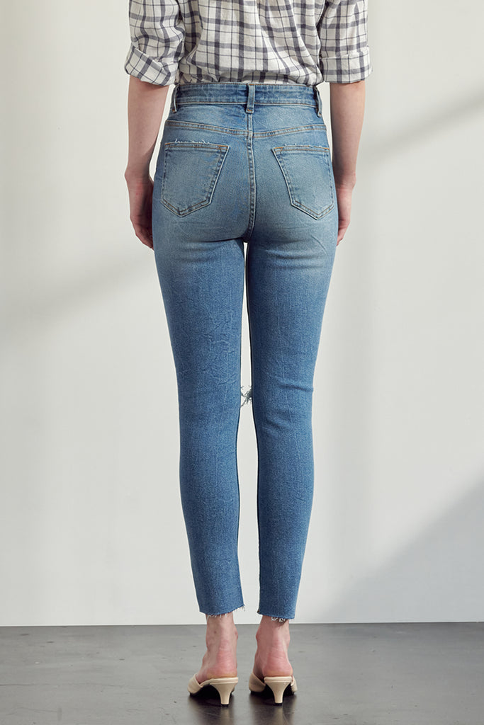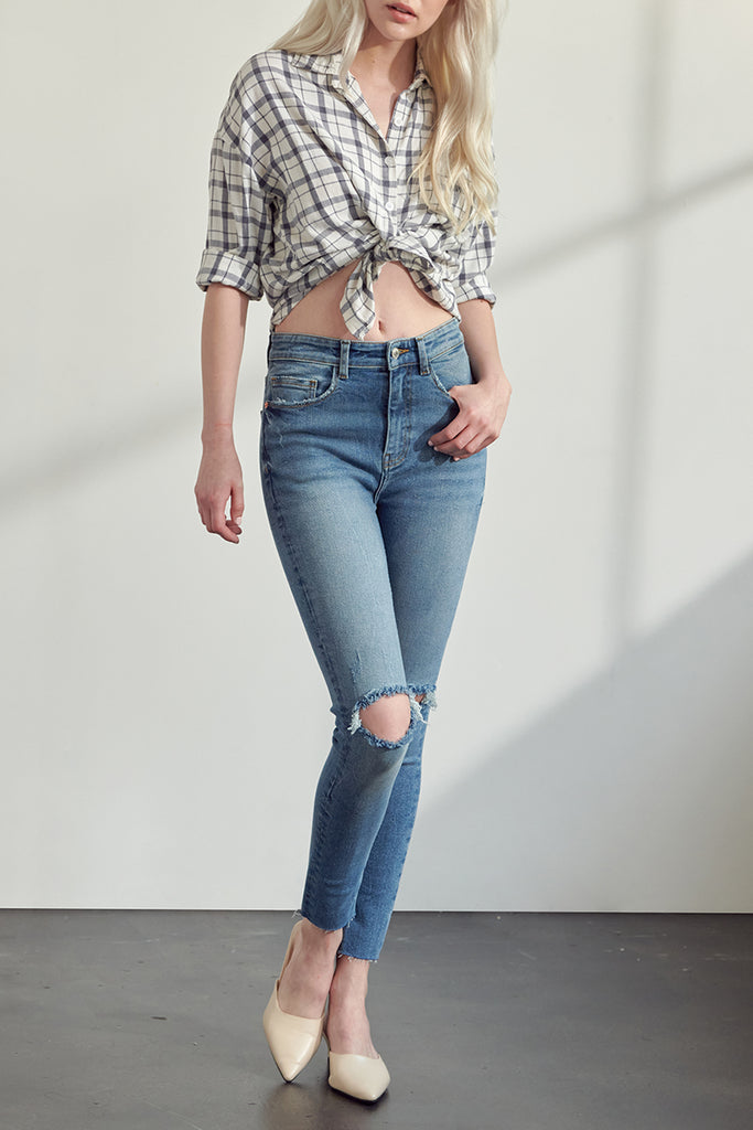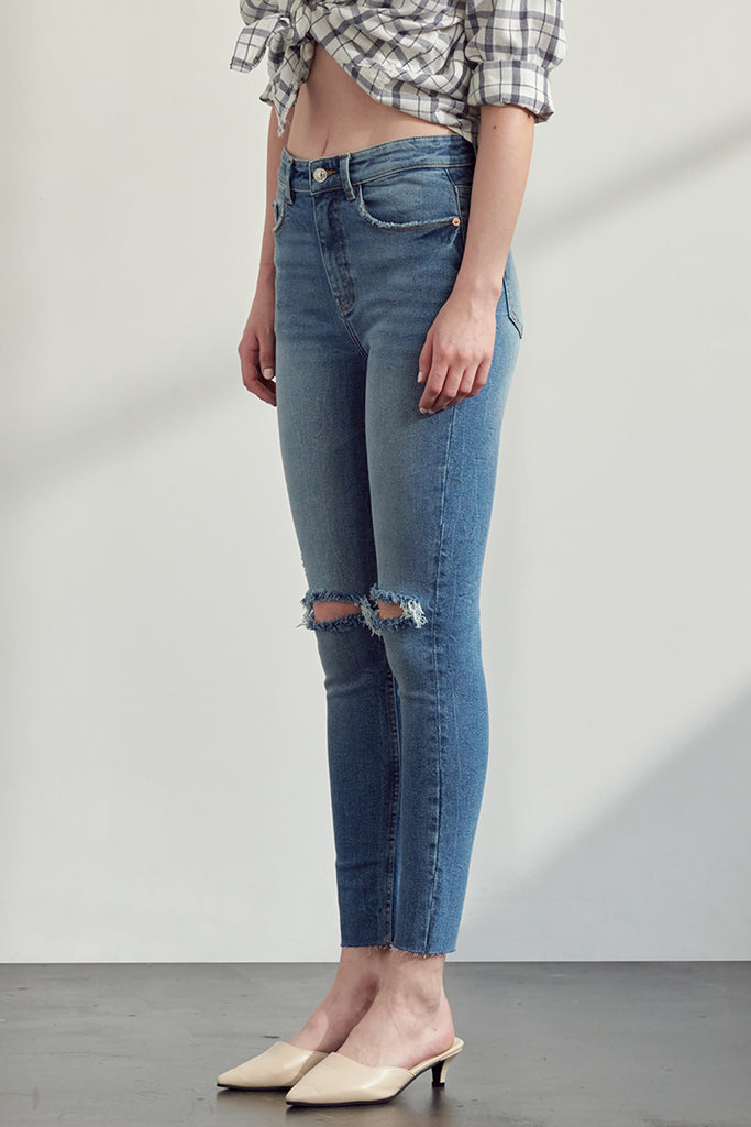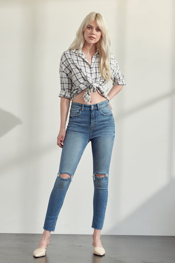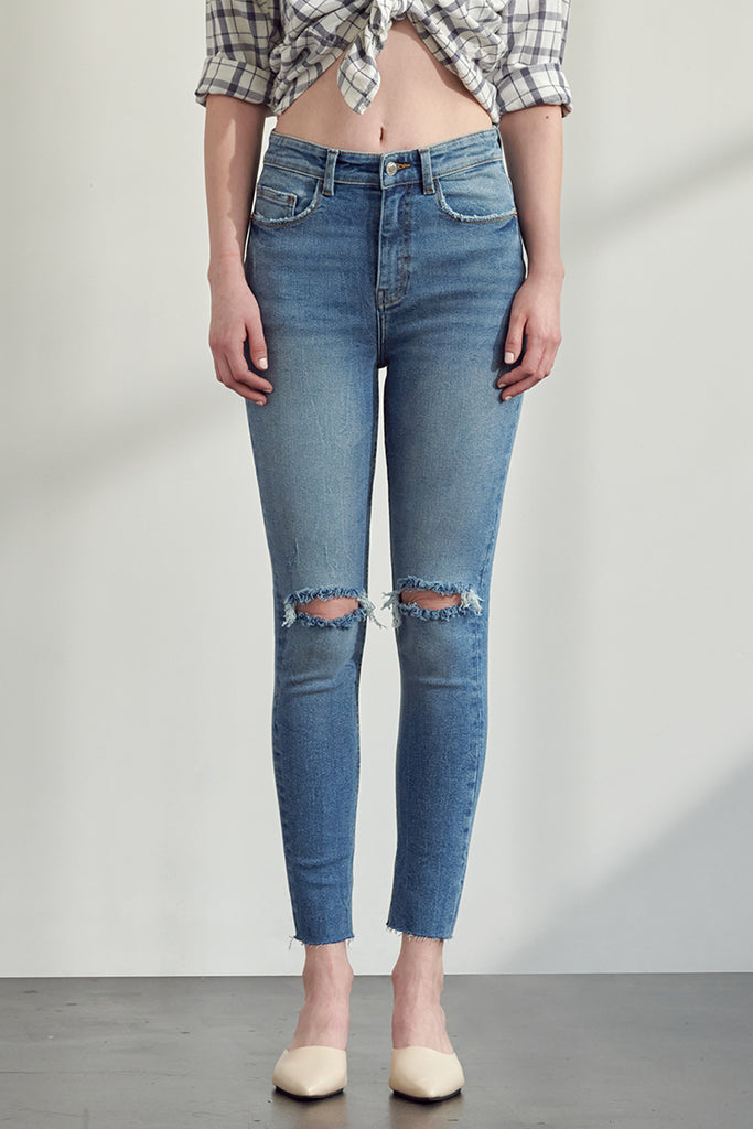 High-rise, distressed skinny jeans with five pockets. Front zip and metal button closure. Made with 2% spandex to provide a stretchy, comfortable fit all over.