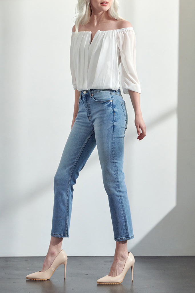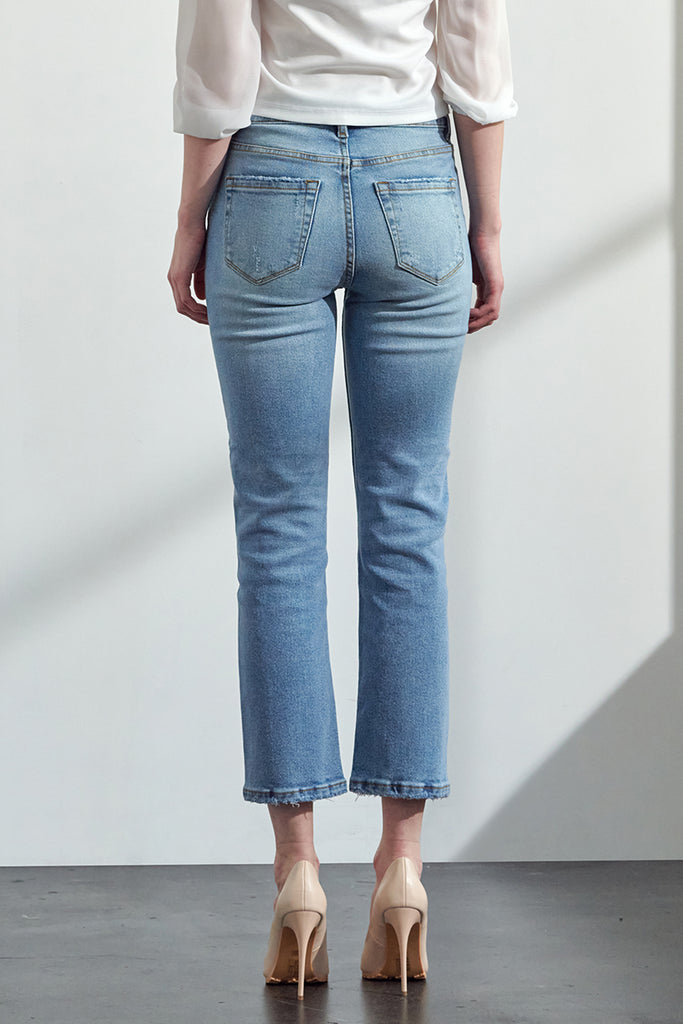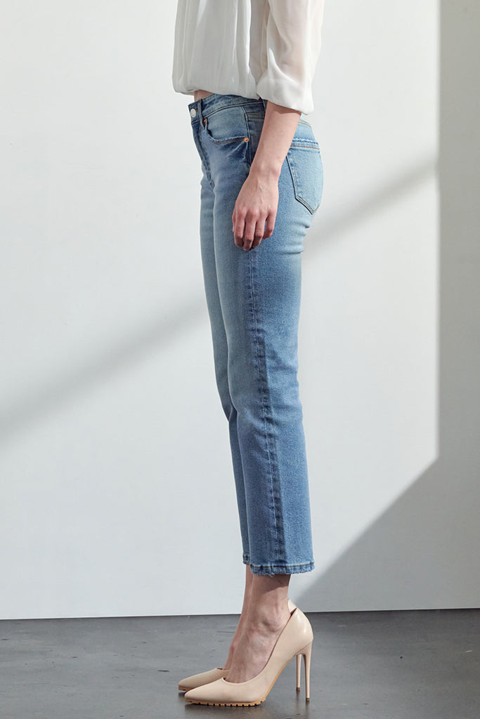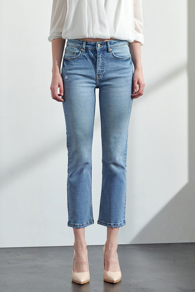 Mid-rise slim straight fitted jeans with five pockets. Front zip and metal button closure. Made with 2% spandex to provide a stretchy, comfortable fit all over.