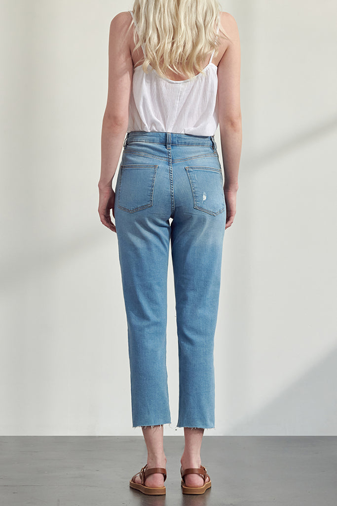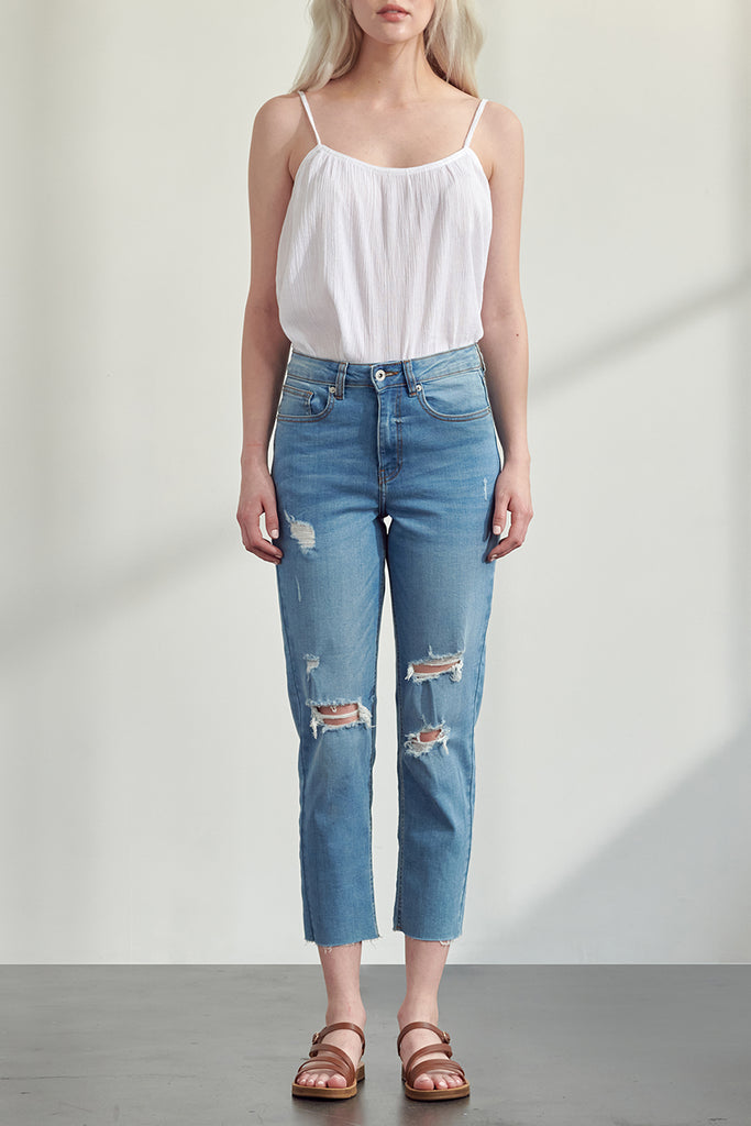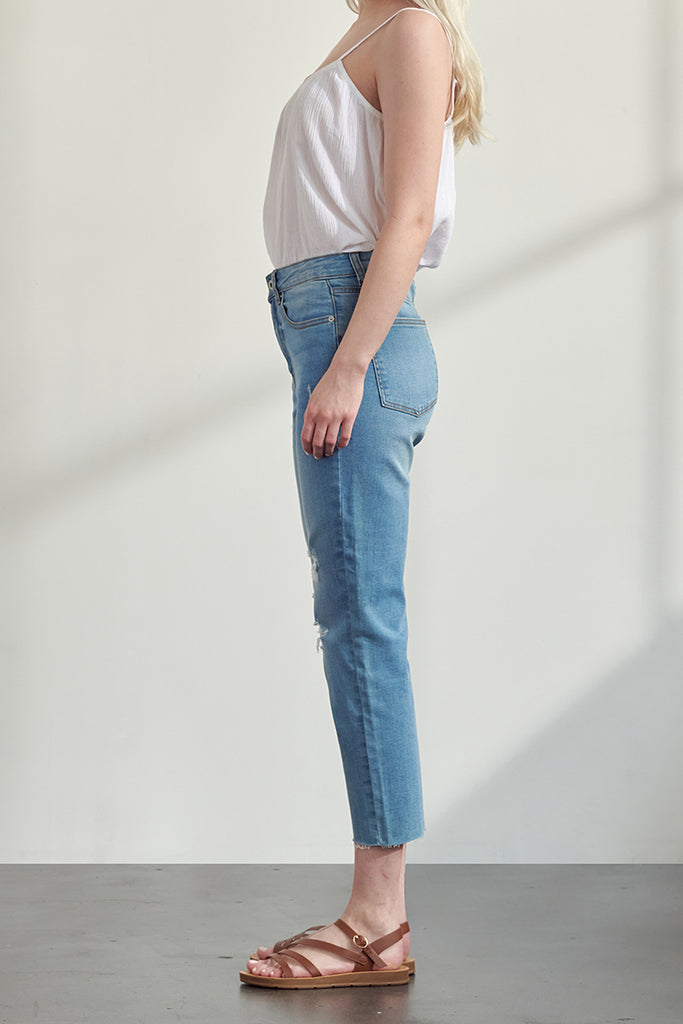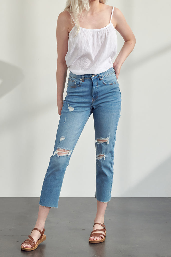 High waisted & distressed slim straight fit.