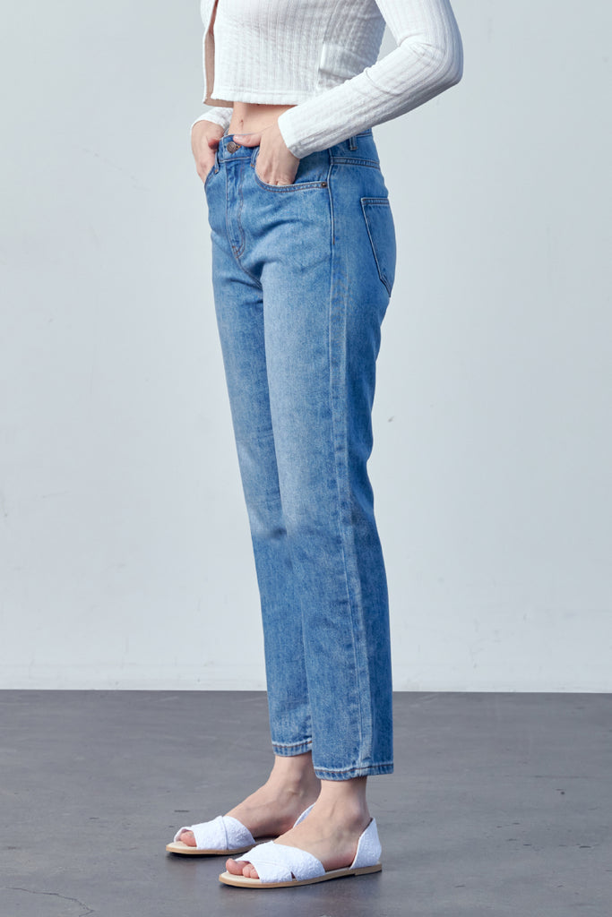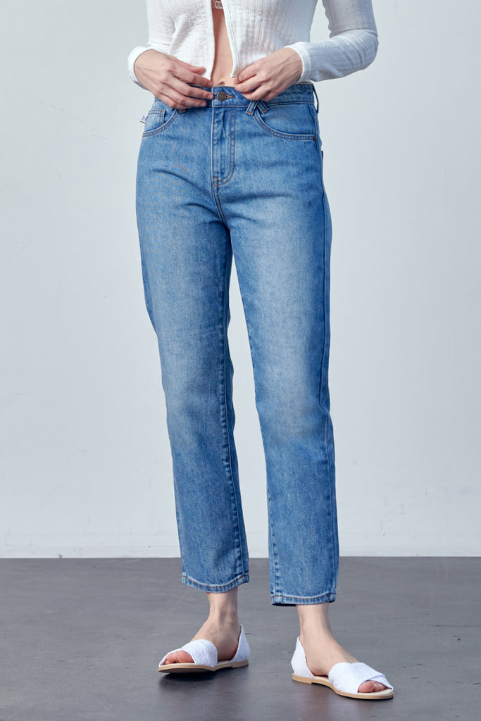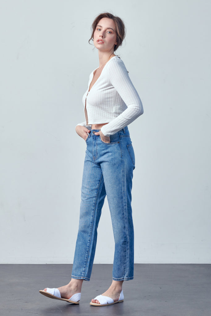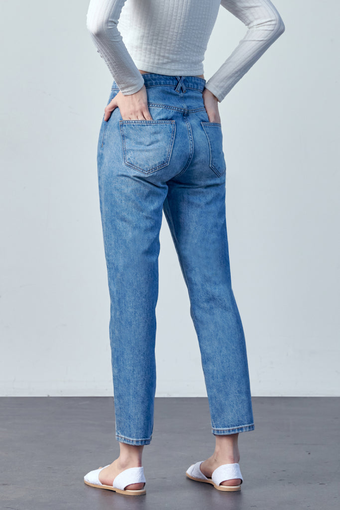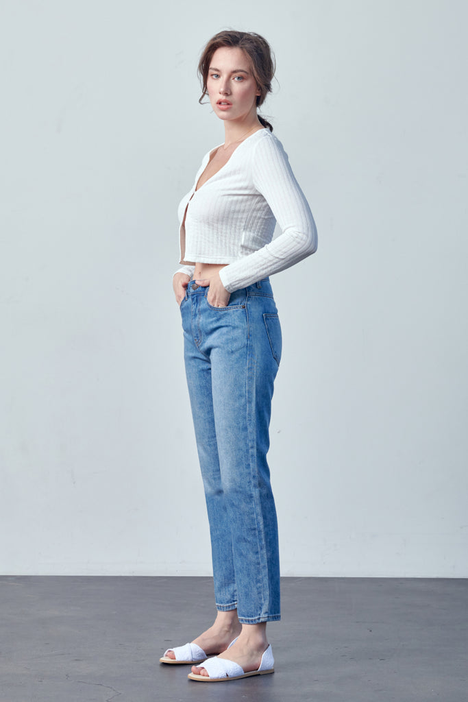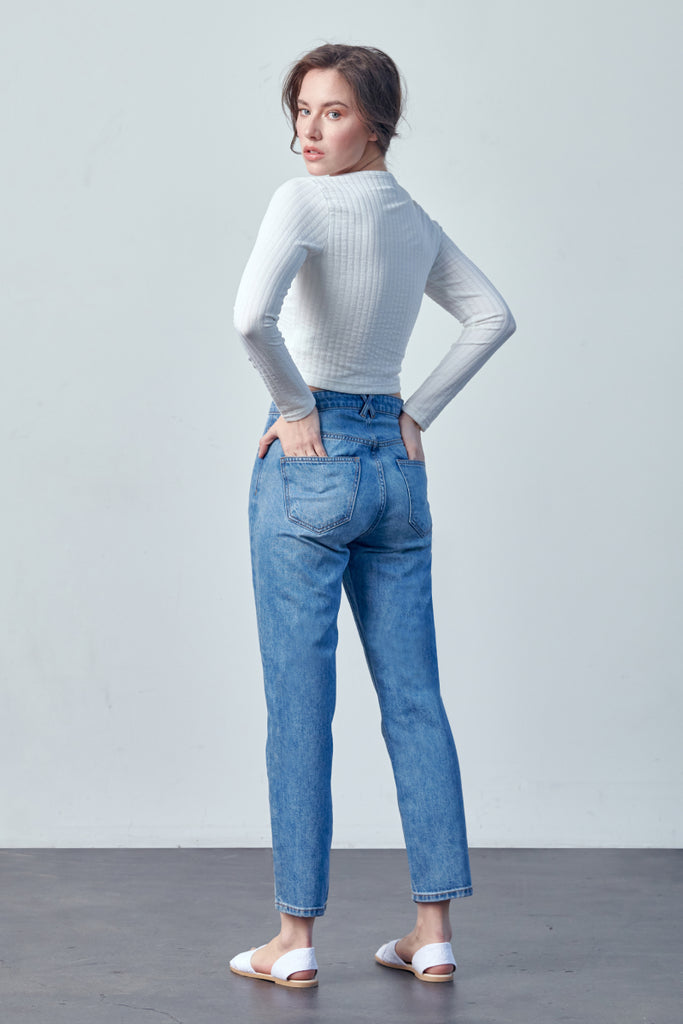 Relaxed, high waisted boyfriend jeans with comfortably fitted hip in rigid fabric. Traditional five pockets with zip and metal button closure.