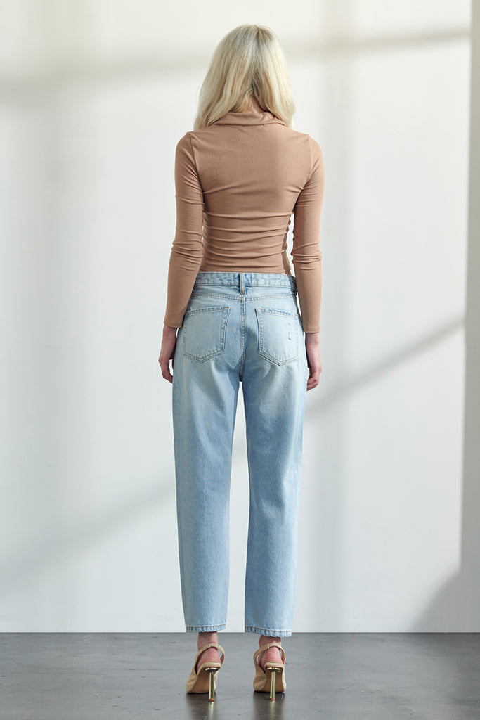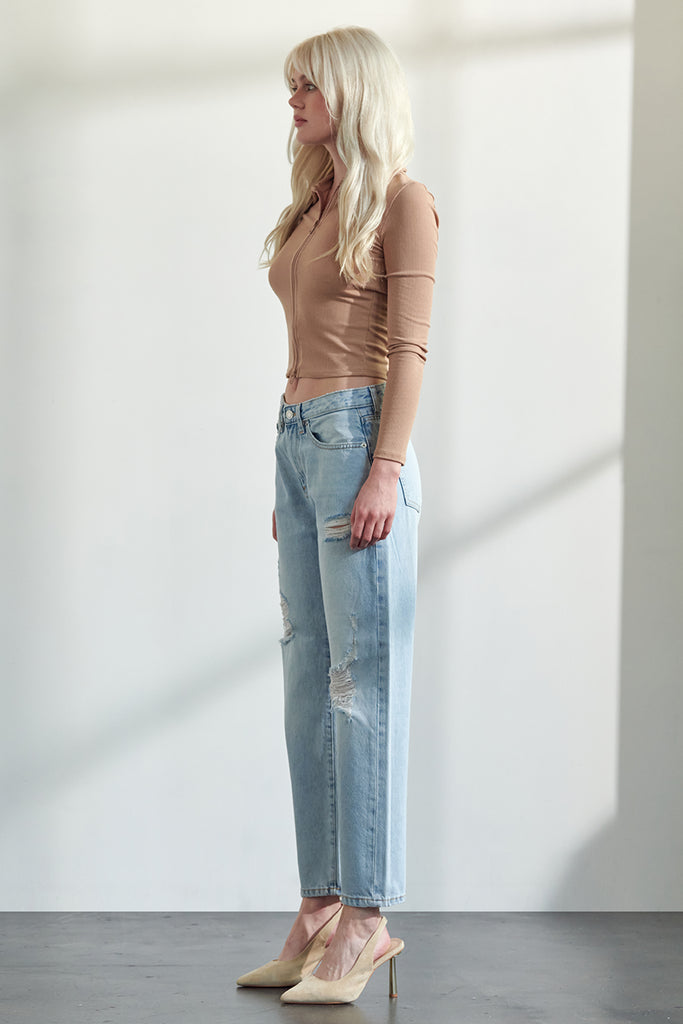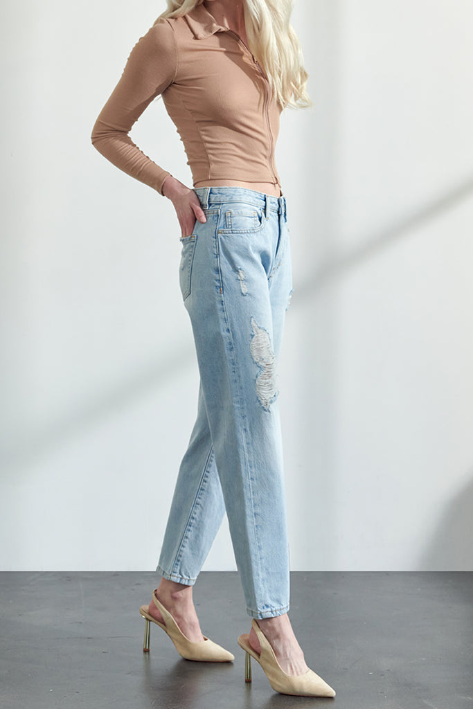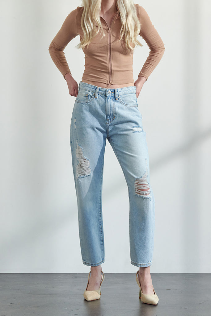High-waisted mom jeans with distress. Relaxed and comfortable at the hip.
